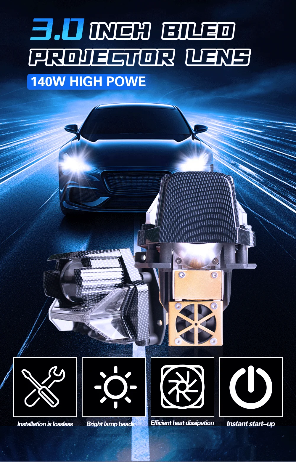 140W 6000K 3 Inch Lens Easy Install Strong Stability Increases Original Car Lighting Brightness 3 Times 4-5 Lanes Light Width