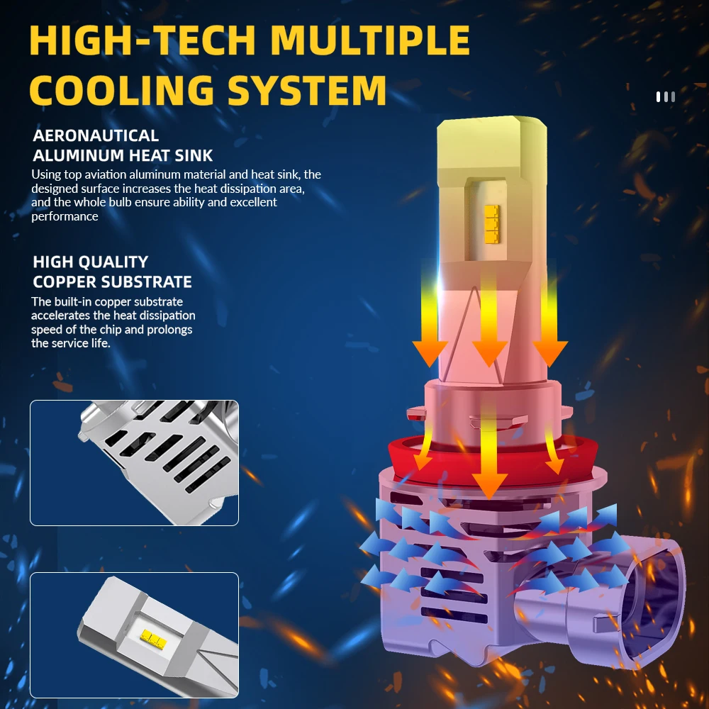1.Copper tube and Kirk-chip heat dissipation, the heat dissipation area is three times larger than ordinary aluminum body heat dissipation. 2.Efficient cooling system 100% increase lifespan 3.Intelligence circuit board with overheat protection device. 4.Quick heat dissipation make led headlight work more stability,lifespan longer.