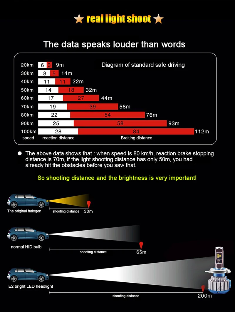 6. Car led headlight with import LED Chips, High lumen Flux: 4000LM, (As Comparison, traditional Halogen lamp usually less than 2000LM)