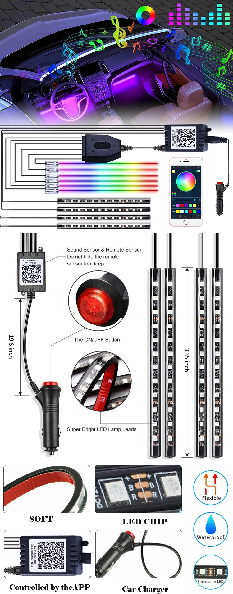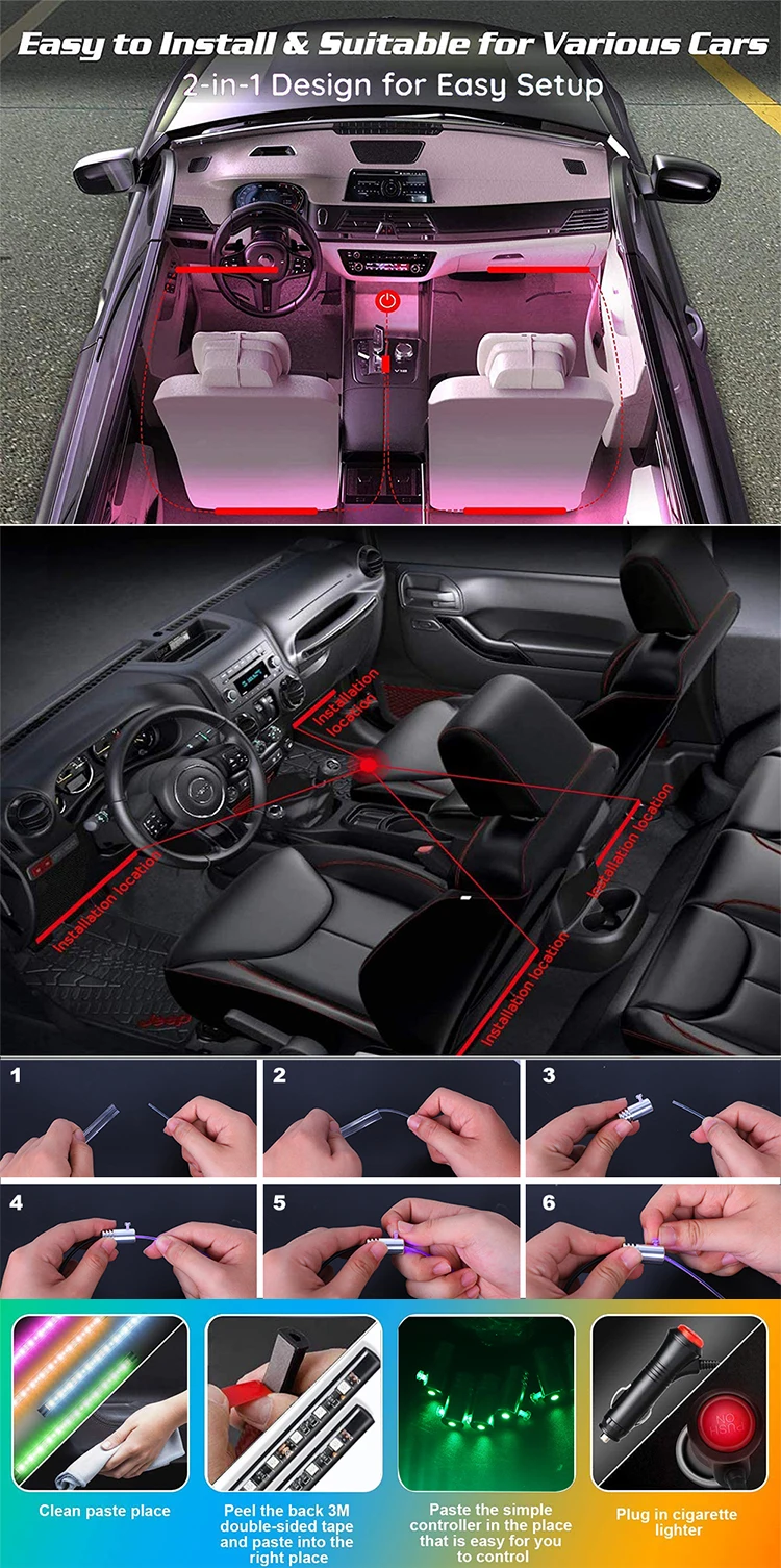 double-sided behind each car led strips lights and apply it underneath the seats or under the bumper(of course you can put it on anywhere that can be charged with USB Port), making it diverse for a range of vehicles, cars, trucks, SUVs.