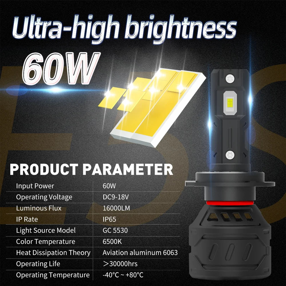 Xenplus Factory Wholesale E5S LED Car Headlights 60W 16000LM 6500K White DC9-18V Universal Fit H1/H3/H4/9007 Vehicle