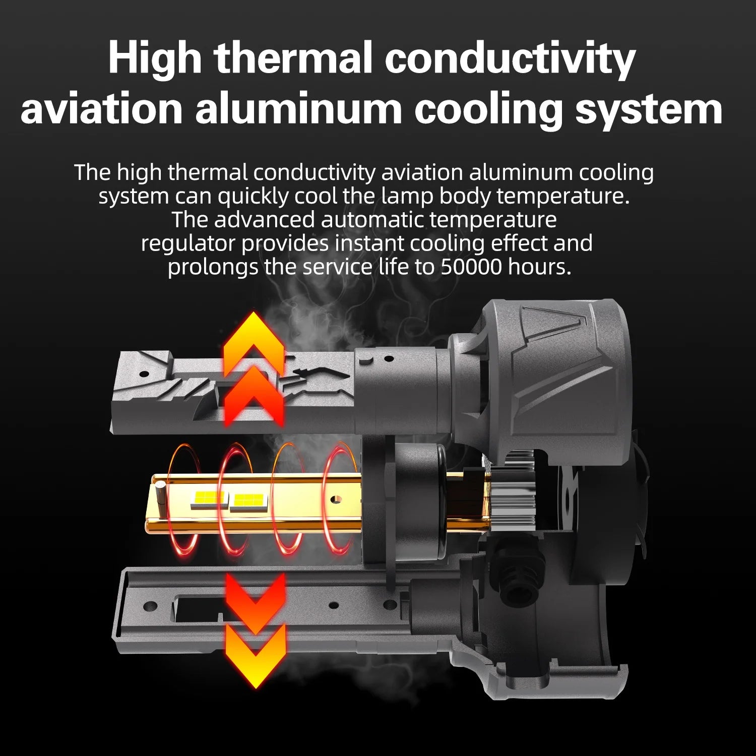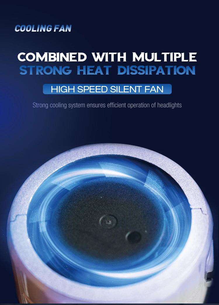 <Over 5,0000 Hours Lifespan>: Aviation aluminum body, Double“L” heat tube for heat dissipation and unique heat sink design with 15000RPM cool fan provides outstanding cooling performance and durability, equivalent to 100 halogen bulbs.